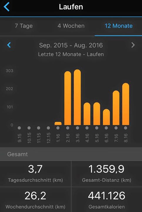 Nach dem Jahr voller Höhen und Tiefen freue ich mich, wenn ich das noch hinbekomme. Dass der Körper wieder leistungsbereiter ist, sieht man auch anhand meiner Trainingskilometer. Es geht aufwärts.
